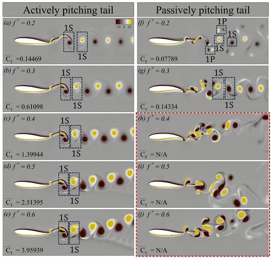 Figure 13a and Figure 13f show the wake topology of the actively and passively pitching tail configurations, respectively, at . For the case with an active tail, the wake resembles that observed at Re = 500, whereas the passive tail exhibits a – shedding pattern. As the increases to , the actively pitching tail maintains the same topology, while the passive tail develops a reverse von Kármán vortex street characterized by a wake pattern. Although the wake corresponds to a reverse von Kármán street, minor instabilities begin to appear, as shown in Figure 13g. For the actively pitching tail, an increasing Strouhal frequency continues to increase thrust, consistent with the trend observed at Re = 500. However, from –, the wake becomes increasingly asymmetric, with the asymmetry becoming more pronounced at a higher (Figure 13c–e). On the other hand, for the passive tail, the red-outlined region (Figure 13h–j) highlights the growing instabilities in the wake as the Strouhal frequency increases.