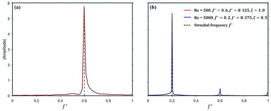 The configurations with passively pitching tails provide valuable insight for a detailed analysis. Although the pitching amplitude in these cases is comparatively smaller than that of the actively pitching tails, the pitching frequency remains near resonance, as indicated by the spectral compositions of the pitching response of the tail in Figure 16a,b. The normalized fundamental frequency aligns well with the heaving frequency of the corresponding case, as highlighted by the dashed line.