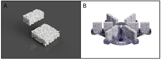 Bone inorganic matrix mimicking scaffolds have been fabricated according to the procedures described in Zenobi et al., 2023 [23] using a percentage porosity of 52.5% for reproducing the healthy bone condition. The scaffolds were designed using Meshmixer 3.5 software (v.2018, Autodesk, San Rafael, CA, USA). Briefly, the process began with a solid of 10 mm × 10 mm × 3 mm. A three-dimensional random cluster of spheres was subtracted from this solid to create a porous structure. The sphere diameter (pore size) and center-to-center distance (spacing) values were set at 700 μm [23]. The printing was performed using a commercially available fused-filament fabrication (FFF) 3D Printer (Prusa MK3S, Prusa Research, Prague, Czech Republic). The printer is equipped with a 0.4 mm brass nozzle, a direct-dive extrusion system, and a heated build plate, and operates with a layer height range of 0.05–0.30 mm and a maximum nozzle temperature of 300 °C. The printing material was a PLA filament (diameter 1.75 mm) supplied by FILOALFA (Italy). According to the manufacturer, the material has a density of 1.24 g/cm3, a tensile strength of 53 MPa, and a tensile modulus of 3.6 GPa. The melting point is approximately 135 °C, consistent with typical PLA grades. This PLA filament was carefully heated to a precise extrusion temperature of 205 °C, allowing it to flow through a nozzle with a diameter of 0.4 mm. During the printing process, the printer bed was consistently maintained at a temperature of 60 °C to ensure optimal adhesion and stability. Importantly, it is worth noting that all samples underwent fabrication using identical printing parameters, thereby guaranteeing the homogeneity and standardization of the produced scaffolds and control specimens. The dimensions obtained for the parallelepiped scaffolds were 10 mm × 10 mm × 3 mm (Figure 3A).