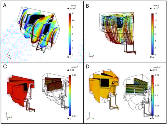 Fluid velocity slice plot in the ZX-plane distributed along Y-axis (A), and streamlines (B). Oxygen concentration distribution in the bioreactor with scaffolds seeded with 4 × 105 cells per scaffold (C) and 4 × 106 cells per scaffold (D).
