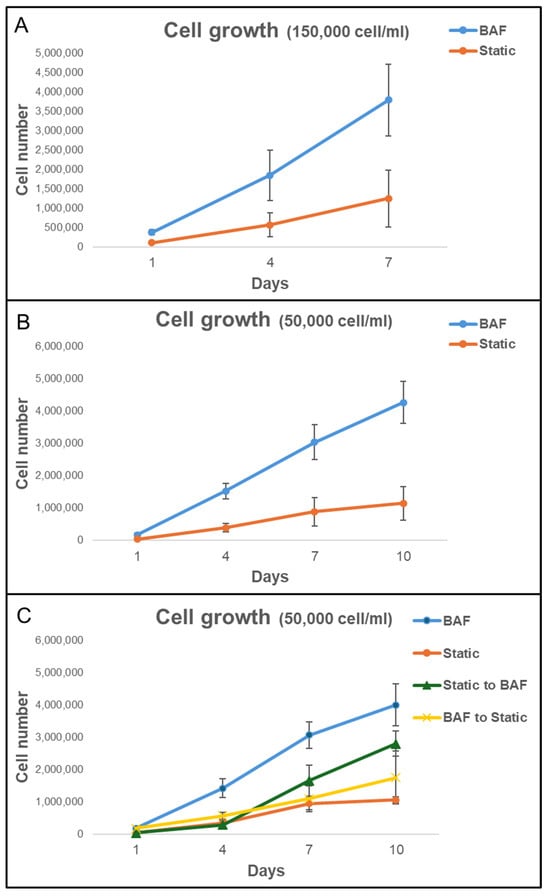 Analysis of cell growth on PLA scaffolds under different experimental conditions in the bioreactor BAF versus static conditions. The growth curves were obtained using two initial SAOS-2 cell concentrations: (A) 150,000 cells mL−1 and (B) 50,000 cells mL−1. (C) Analysis of cell growth on scaffold after the shift from static to dynamic conditions (Static to BAF) and from dynamic to static conditions (BAF to Static). The BAF bioreactor consistently supports a higher cell proliferation rate compared to cultivating in static conditions. Data are shown as mean SD. n = 6 for each experimental condition.