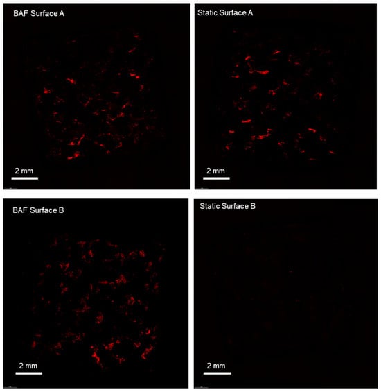 Cell colonization was further studied in terms of cell distribution across the different surfaces of the scaffolds, comparing the bioreactor-dynamic 3D culture to traditional static culture methods. To assess cell distribution, the confocal microscopy method was used; hence, the cell nuclei were stained with the fluorescent propidium iodide prior to visualization. Figure 8 reports the images of the entire surface of the analyzed scaffolds, acquired at 4× magnification. The static culture conditions do not allow for homogeneous colonization of the scaffolds, in contrast to what is observed in the dynamic culture conditions achieved using BAF. Under static culture conditions, cells primarily adhere to surface A, which is the upper surface where the cell suspension is directly deposited during seeding. In contrast, surface B, oriented towards the bottom of the plate, shows limited cell colonization. Conversely, the dynamic 3D cell culture conditions, achieved using BAF, led to the colonization of both surfaces of each scaffold. This is attributed to the fluid dynamics generated within the bioreactor, which keeps the cells in suspension, gently mixes them and permits homogeneous mass transfer.