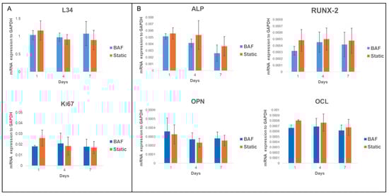 qRT-PCR analysis of the expression of (A) key constitutive (L34, Ki67) and (B) differentiation markers (RUNX2, AP, OPN, and OCL) in SAOS-2 cells cultured for up to 7 days on PLA scaffolds under dynamic BAF bioreactor conditions (BAF) versus static conditions (Static), normalized to the expression of the constitutive gene GAPDH. Data are shown as mean SD. n = 3 for each gene analyzed, in both experimental conditions (BAF vs. Static conditions).