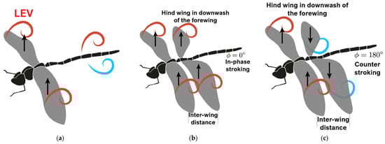 - Alexander, D.E. Unusual phase relationships between the forewings and hindwings in flying dragonflies. J. Exp. Biol. 1984, 109, 379–383. [Google Scholar] [CrossRef]