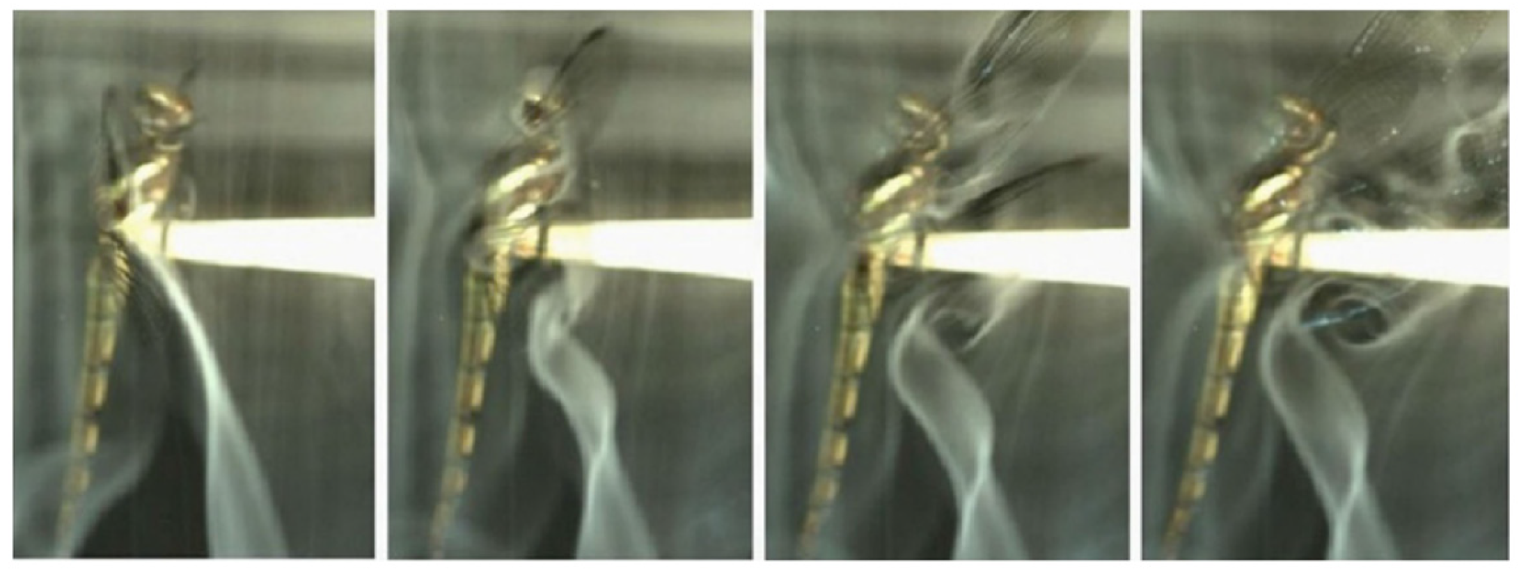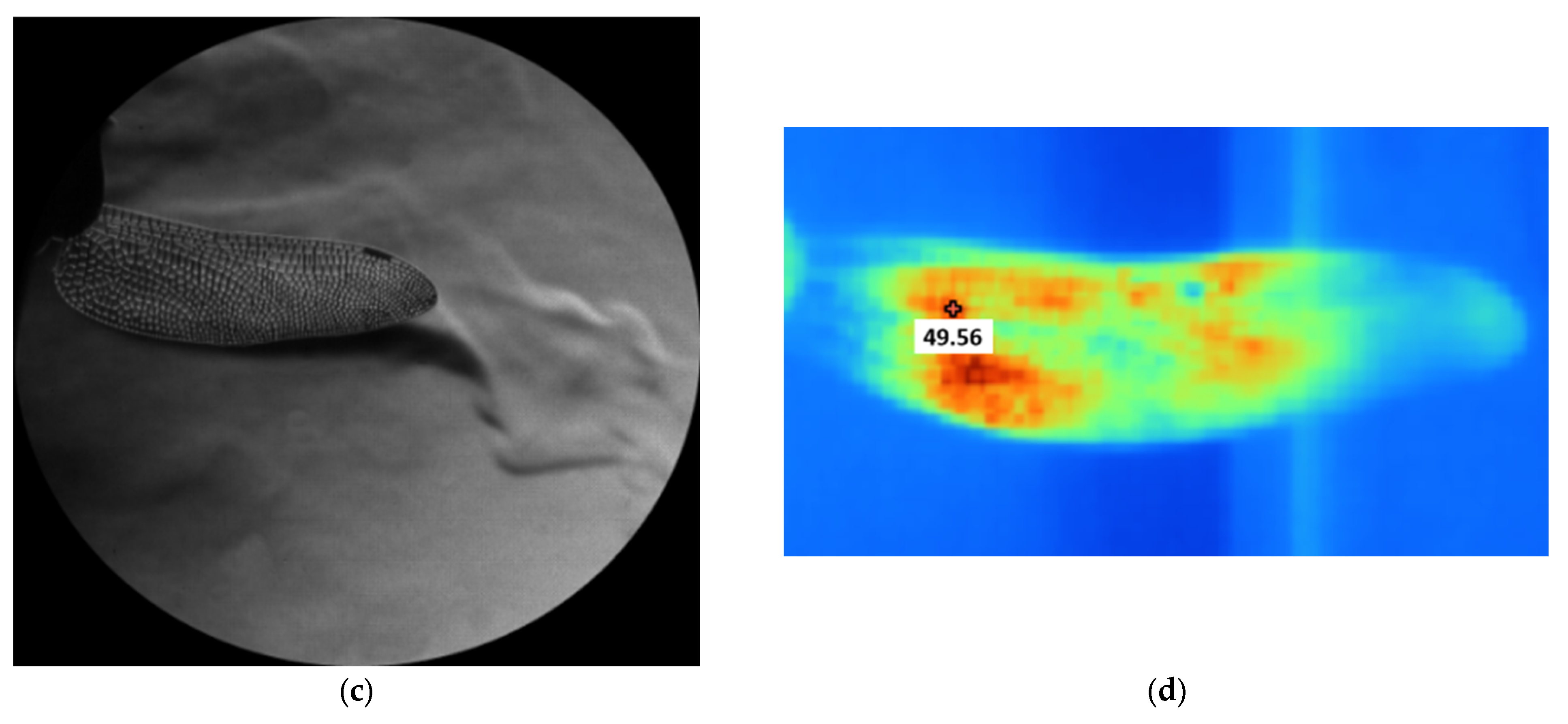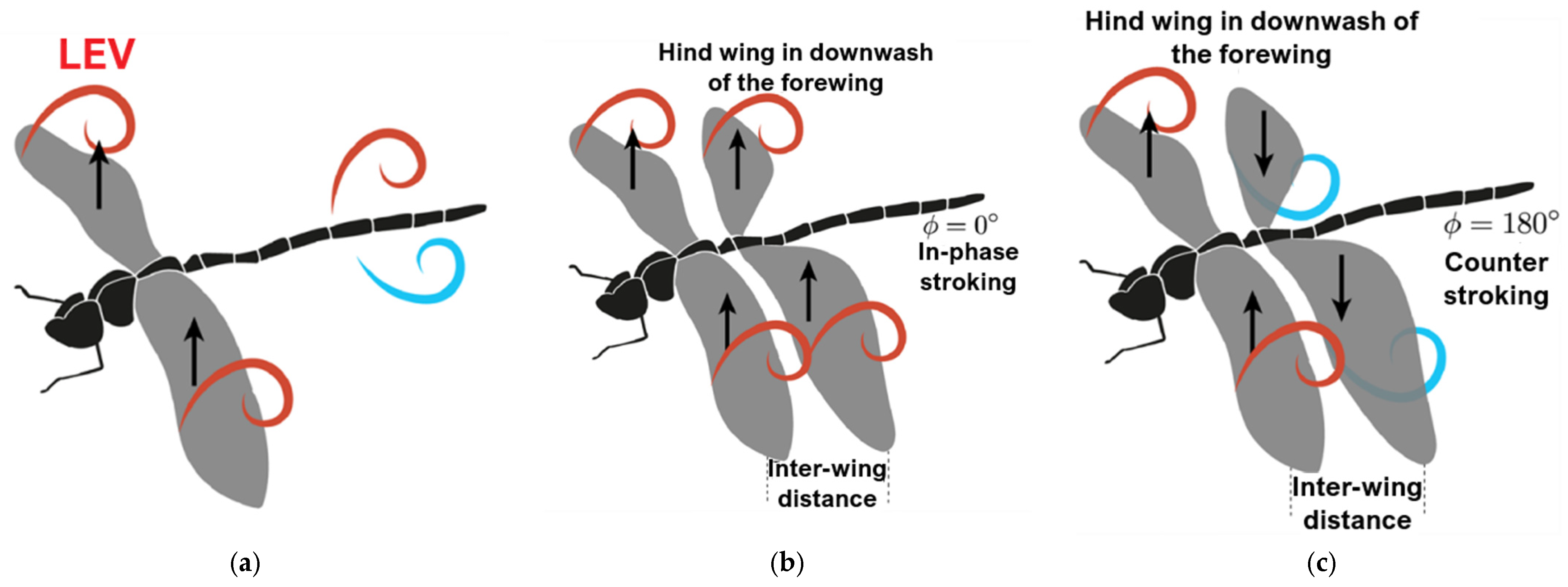 - Thomas, A.L.; Taylor, G.K.; Srygley, R.B.; Nudds, R.L.; Bomphrey, R.J. Dragonfly flight: Free-flight and tethered flow visualizations reveal a diverse array of unsteady lift-generating mechanisms, controlled primarily via angle of attack. J. Exp. Biol. 2004, 207, 4299–4323. [Google Scholar] [CrossRef]