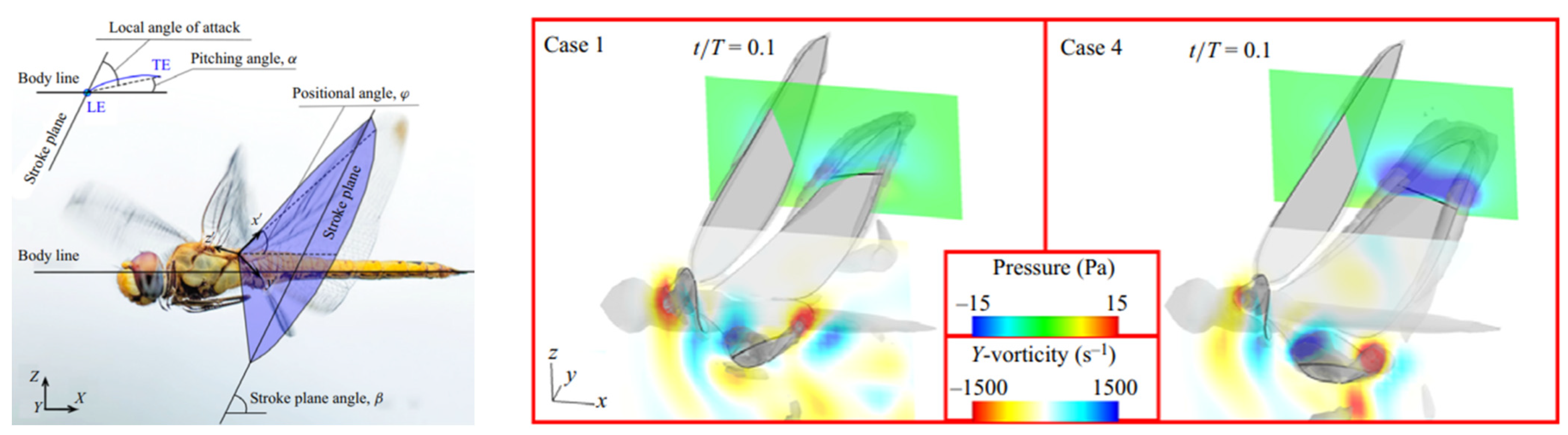 - Li, Q.; Zheng, M.; Pan, T.; Su, G. Experimental and Numerical Investigation on Dragonfly Wing and Body Motion During Voluntary Take-Off. Sci. Rep. 2018, 8, 1011. [Google Scholar] [CrossRef]