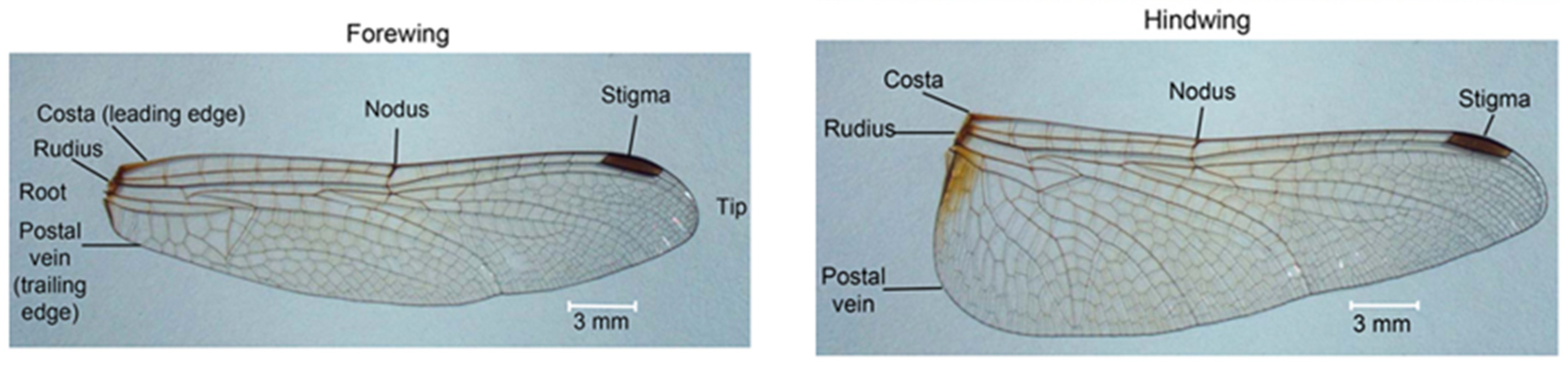 - Bomphrey, R.J.; Nakata, T.; Henningsson, P.; Lin, H.-T. Flight of the Dragonflies and Damselflies. Phil. Trans. R. Soc. B 2016, 371, 20150389. [Google Scholar] [CrossRef]