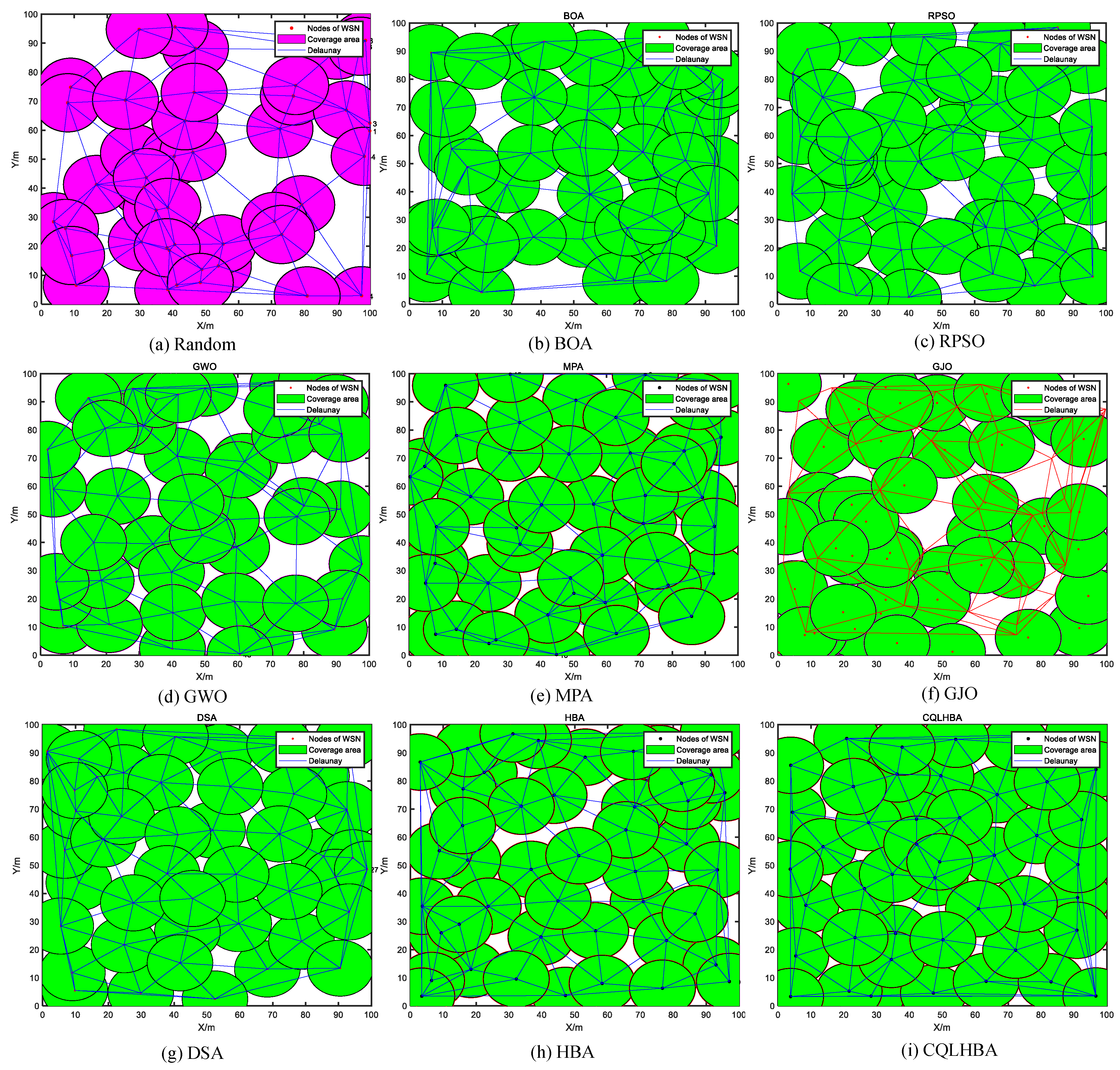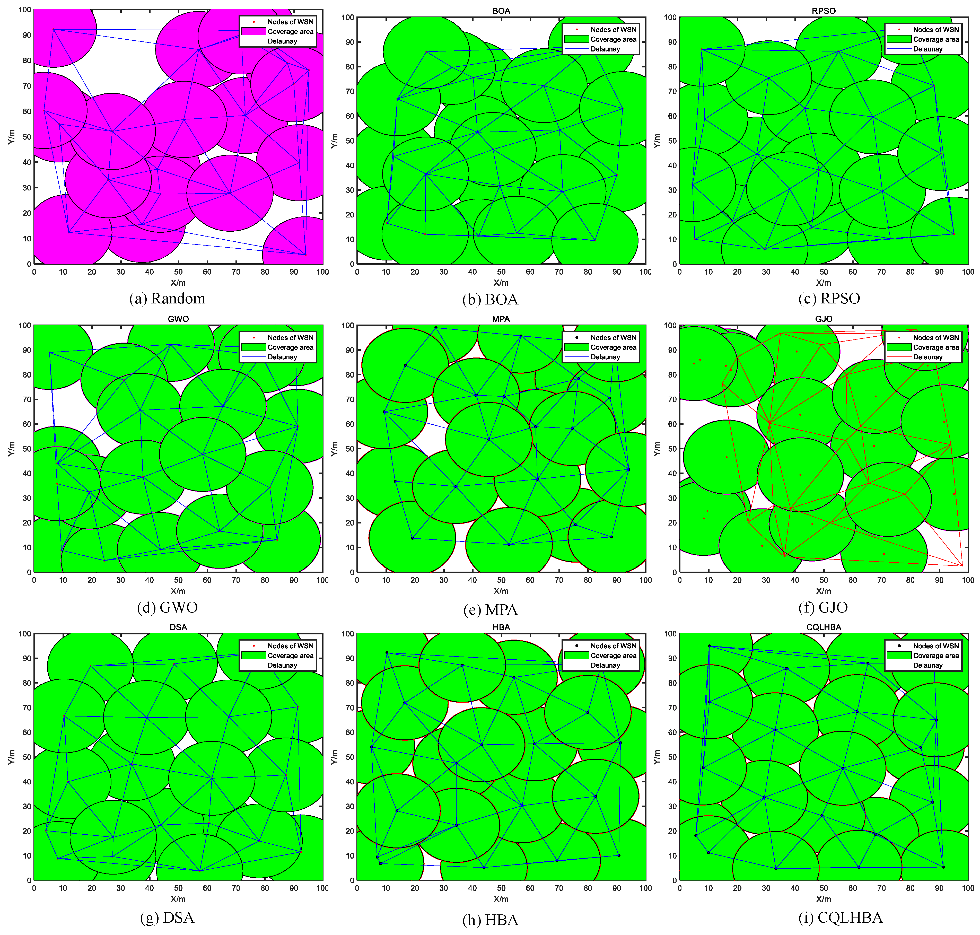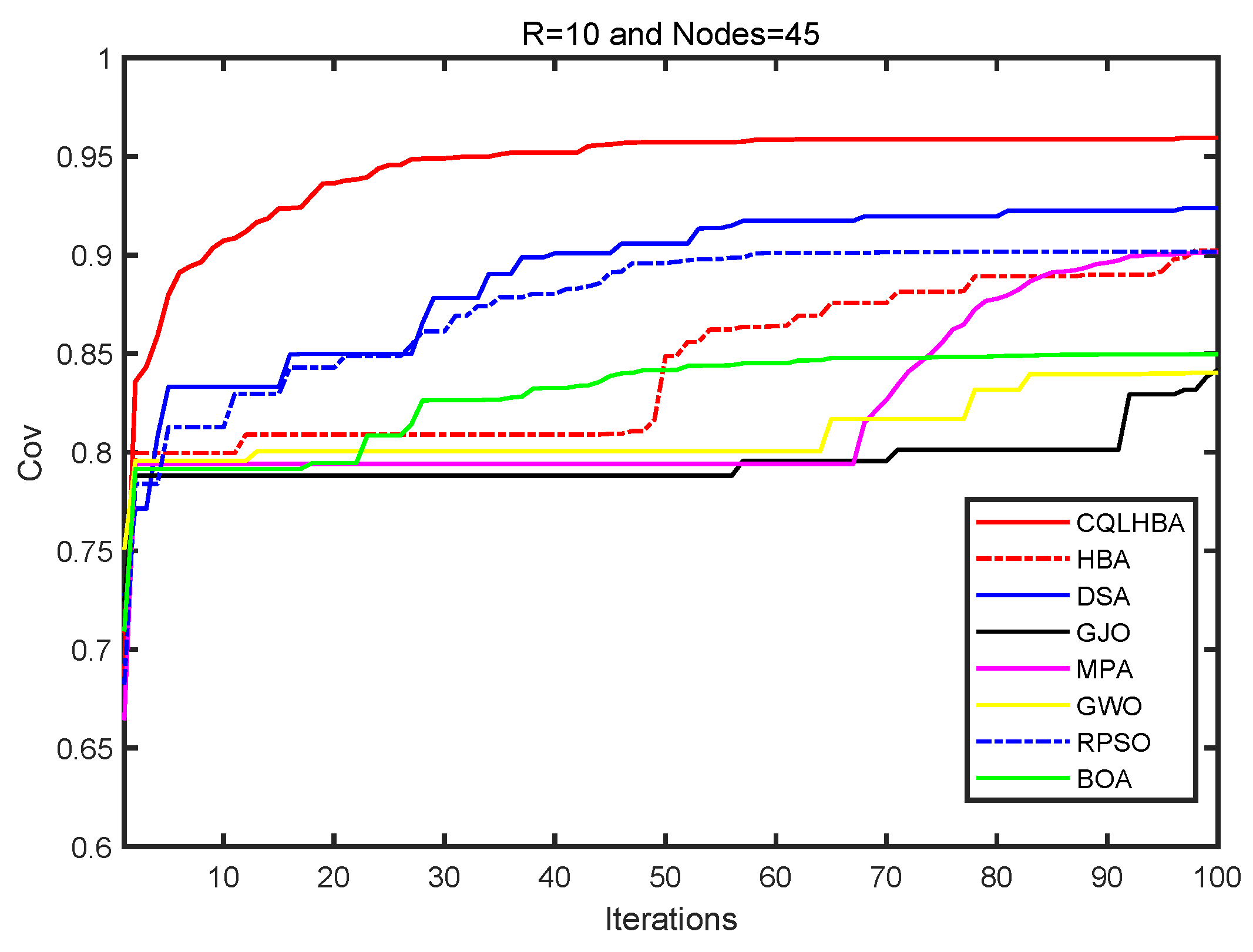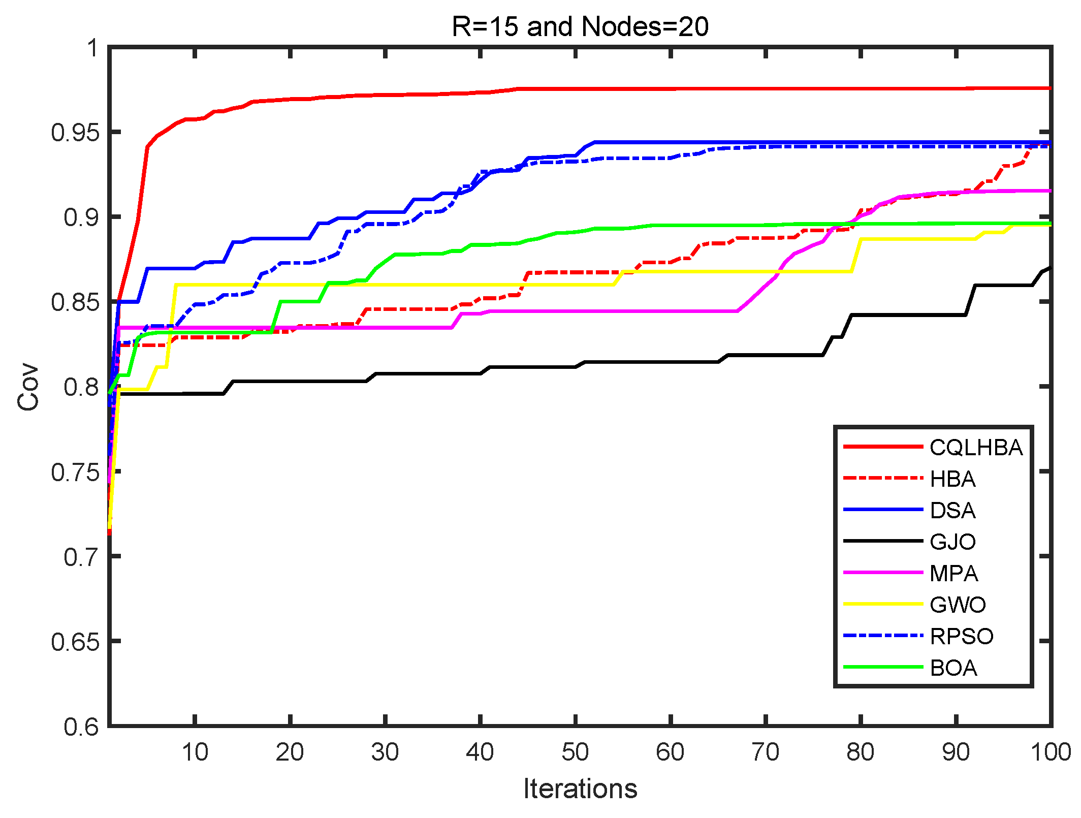 - Experiment 1: Objective: To analyze the coverage optimization performance of CQLHBA. Setup: 20 nodes were randomly deployed with a sensing radius () of 15 m and a communication radius () of 30 m. Procedure: The comparison algorithms were run for 100 iterations, and their performance was measured based on execution time and the achieved coverage ratio.