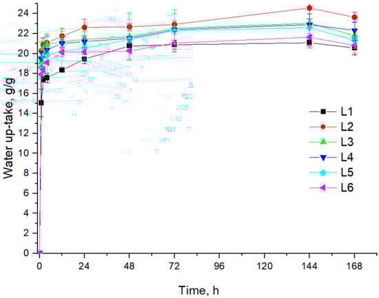 All the composites L1–L6 absorbed over 15 g/g water fast, in the first minutes, and then they swelled slowly in the first 24 h and reached equilibrium. The composite consisting of collagen and β-TCP (L1) absorbed the smallest amount of water, reaching about 20 g/g after 6 days. The adding of ZnO increased the water absorption; such results were also obtained by Andonegi et al. [59], when they characterized different concentrations of ZnO nanoparticles incorporated in native collagen films. All the samples based on collagen, β-TCP and ZnO absorbed 17–20 g/g water in the first minutes.