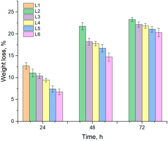 After full swelling, the composite sponges were degraded in collagenase, a specific enzyme for collagen, which degrades the collagen molecules down to amino acids. Figure 2 presents the biodegradation of composite sponges L1–L6 during 72 h.