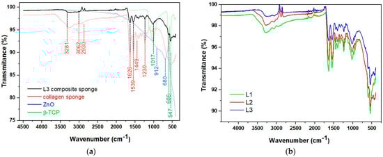 The interaction between the components is given by FT-IR analyses as follows. Figure 3a presents the FT-IR for each component of composites, and Figure 3b shows the overlap of FT-IR spectra for composite sponges L1—collagen and β-TCP, L2—collagen, β-TCP and ZnO and L3—collagen, β-TCP and ZnO modified with S. thymbra EO. A similar pattern of the FT-IR was registered for composites L3–L6, proving that the small amount of essential oil (i.e., 25 nL reported to 1 g of collagen according to Table 1) does not influence the structure of samples. Because of this, only L3 overlapped with L1 and L2.