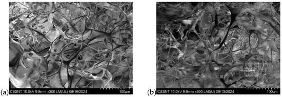 The morphology of biocomposite sponges was observed using the Hitachi SU 8230 Scanning Electron Microscope (Hitachi, Tokyo, Japan) equipped with an Oxford EDX detector–analyzer for sample analysis.