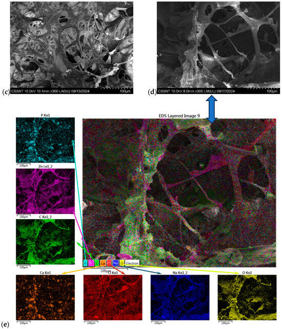 All the composites showed a porous structure with interconnected pores with pore sizes between 50–150 μm, the proper sizes for bone regeneration facilitating cell infiltration and proliferation of osteoblasts and mesenchymal cells, nutrient flow, and vascularization [70,71]. The collagen fibrils are very evident in each sample, and the interaction between collagen and minerals (β-TCP and ZnO) did not affect the 3D structural arrangement. An exemplification of the sample L6 using EDX at ×300 magnification (Figure 4e) showed the accumulation of calcium, zinc, and phosphate on the collagen fibrils. The Na and Cl ions come from the technological process of obtaining collagen. It is visible that the components are very homogeneously spread into the sponge.