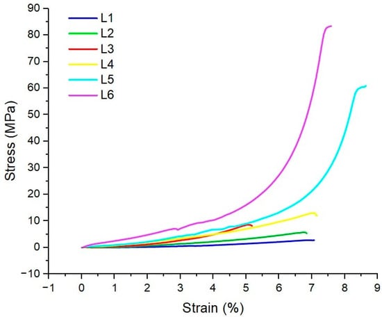 Compressive stress–strain curves of L1–L6 composite fillers are presented in Figure 5.