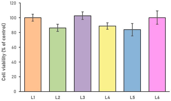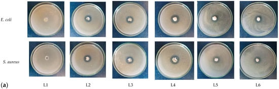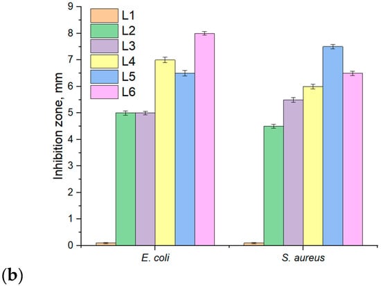 As Figure 6 shows, there is no antibacterial activity for sample L1, which does not contain ZnO and EO. The antibacterial activity was present for all the samples with ZnO content, and the inhibition zone started to increase when the S. thymbra L. EO was added. The L6 sample showed the highest antibacterial activity against E. coli, and L5 showed the same against S. aureus. This indicates that the combination of ZnO and S. thymbra L. EO has a synergic effect.