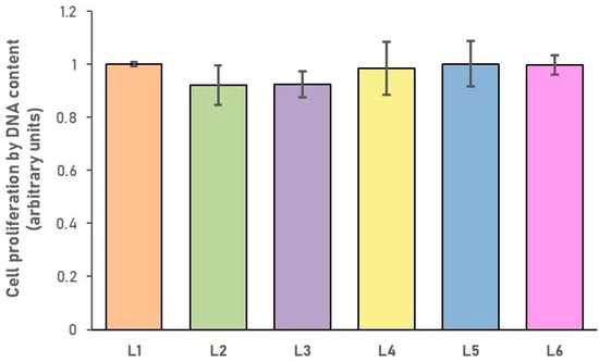 The results of the cell proliferation assay are represented in Figure 8, showing the proliferative behavior of human BMSCs seeded on top of the scaffolds. The DNA content of the cells grown under all conditions is comparable to the amount of DNA of the cells cultured on the control sample (L1), showing that the different concentrations of S. thymbra L. EO did not affect the cell proliferation.