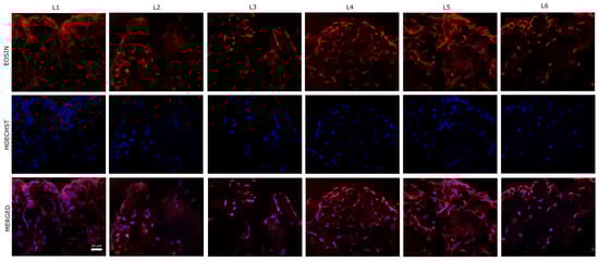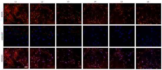 Following the viability and proliferation assays, BMSCs were seeded on top of the composites placed in a 96-well plate. After 14 h, the samples were transferred to new wells to further cultivate only the BMSCs that adhered to the matrix. The medium was changed after two days, and on day five post-seeding, the composites were fixed in 4% PFA (paraformaldehyde) (Sigma Aldrich, St. Louis, MO, USA), overnight, at 4 °C, followed by inclusion in a Shandon Cryomatrix (Thermo Scientific, Waltham, MA, USA) and cryosectioning. To assess the cell colonization capacity of the sponge composites, we performed an eosin–Hoechst staining. Briefly, the sections were fixed with methanol, washed in PBS, followed by 2 min in eosin and differentiation in 70% ethanol and distilled water for 1 min, and the nuclei were stained with Hoechst 33342 solution (Sigma Aldrich, St. Louis, MO, USA) for 10 min. After a final wash and mounting with Shandon Immu-Mount (Thermo Scientific, Waltham, MA, USA), the samples were visualized using a Zeiss Observer D1 fluorescence microscope (Zeiss, Oberkochen, Germany).