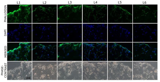 Cell adhesion is a complex process involving the reorganization of cytoskeleton proteins like actin. Thus, F-actin staining was used to examine the cell behavior on day 5 post-seeding. Precisely, it helped in visualization of the cell attachment and distribution on the scaffolds. As shown in Figure 11, the upper surfaces (seeding surface) are densely populated, being almost completely covered by a cell layer. At this level, the morphology of human BMSCs is highly elongated. In addition, the cells were found to spread to the central regions of the scaffolds, maintaining their characteristic spindle shape. Phase contrast light microscopy images of the same areas reveal the porous structure of the scaffold, indicating the cell adherence.