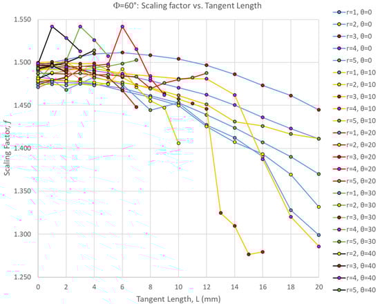 Scaling factor, f, as a function of the suture tangent length for all Φ = 60° cases. Each series represents a combination of the suture tab radius and contact angle used to create the dovetail suture that connects the three archway segments.