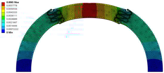 Total deformation (in mm, portrayed at the final indenter displacement of 6.5 mm) of θ = 10°, r = 3 mm, and L = 15 mm suture geometry, which resulted in the smallest scale factor (f = 1.277) of all Φ = 60° cases.