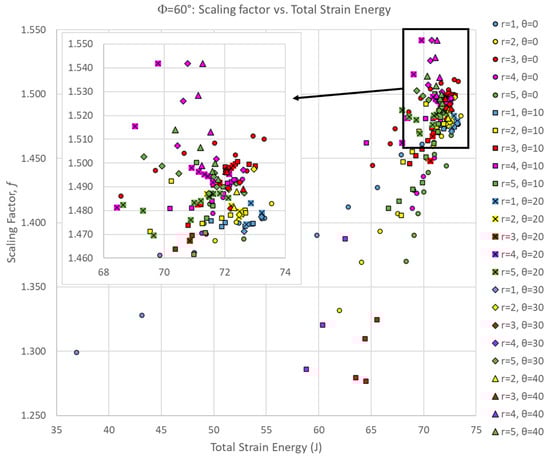 Scaling factor versus total strain energy for all Φ = 60° simulations. For clarity, the inset figure shows the portion of the dataset in the upper right-hand corner of the full dataset.