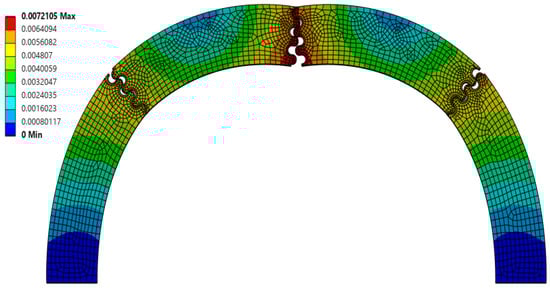 Interestingly, the scaling factor ranged from 1.277 < f < 1.542, with all cases being greater than 1.0 (the value expected if there was a uniform volumetric distribution of strain). This suggests that, even for the weakest suture geometries, the center segment of the archway did carry significantly more strain energy than the archway legs, indicating that the segmentation of the archway helped to isolate any potential damage from the rest of the structure. The suture geometry of θ = 30°, r = 4 mm, and L = 3 mm resulted in the largest scaling factor of 1.542 in the Φ = 60° archways. The final deformation of this suture geometry is shown in Figure 4. The suture geometry of θ = 10°, r = 3 mm, and L = 15 mm resulted in the smallest scaling factor of 1.277 in the Φ = 60° archways. The final deformation of this suture geometry is shown in Figure 5.