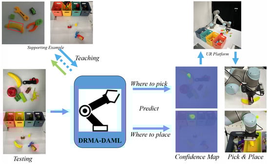 - Finn, C.; Yu, T.; Zhang, T.; Abbeel, P.; Levine, S. One-shot visual imitation learning via meta-learning. In Proceedings of the Conference on Robot Learning, Mountain View, CA, USA, 13–15 November 2017; pp. 357–368. [Google Scholar]