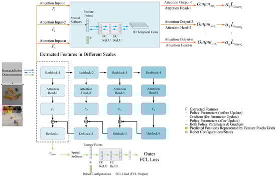 After obtaining the output from each attention head, the features are processed through the ‘deblock’ module to align the dimensions of multi-scale features. The aligned features are then aggregated via residual summation, ensuring that both shallow and deep feature representations are effectively integrated. These aggregated features are subsequently passed through spatial softmax, fully connected layers (FCLs), and a ReLU activation function to produce the final output, which is used to compute the FCL loss.