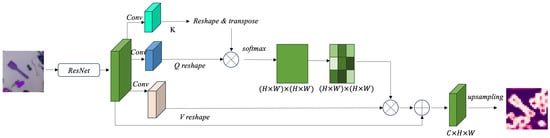 The process of feature extraction using an attention mechanism. The input feature map, extracted by the ResNet backbone, is processed through three convolutional layers to generate the query Q), key (K), and value (V) feature matrices. The key matrix is reshaped and transposed, while the query matrix is reshaped. These are then used to compute the attention score matrix via dot product. The scores are normalized using the softmax function to produce the attention weight matrix. Subsequently, these weights are applied to the value matrix through weighted summation, resulting in an enhanced feature representation. Finally, the enhanced features are combined with the input features using a residual connection, followed by an upsampling operation to produce the output.
