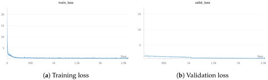 Training and validation losses during the training process. The training loss decreases rapidly in the initial steps and stabilizes as training progresses, showing effective optimization. The validation loss follows a similar trend and eventually converges to a stable low value, indicating good generalization performance without significant overfitting.