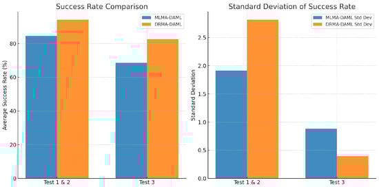 - Robustness in Complex Backgrounds: DRMA-DAML’s superior performance in complex environments (e.g., random noise and distractors) demonstrates its robustness. This robustness is attributed to the deformable convolution layers, which adaptively extract features from spatially transformed inputs, preserving critical shallow and deep feature interactions.