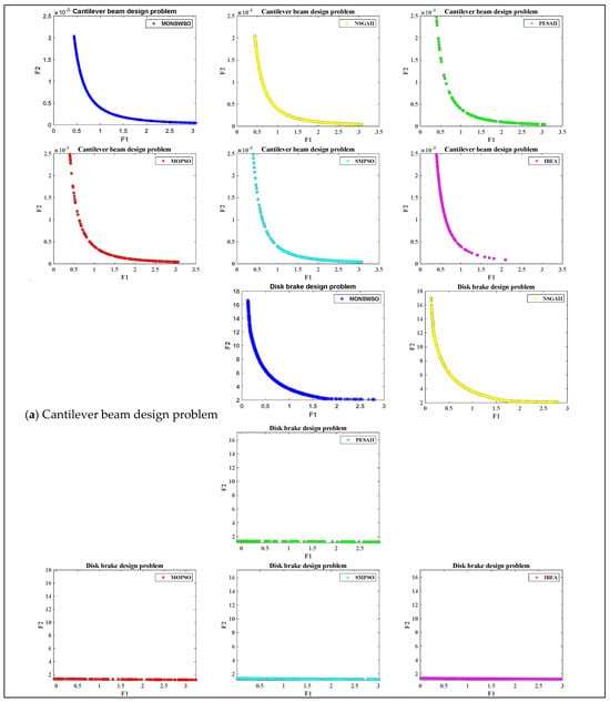 Best Pareto front for each algorithm on four engineering optimization problems.