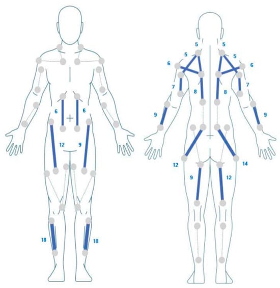 The patient, a 31-year-old male with dystonic spastic tetraparesis due to neonatal trauma, exhibited notable limitations in activities of daily living (ADLs) and required assistance for ambulation and fine motor tasks. Pre-experiment assessments revealed dysarthric speech, sensory deficits mitigated by auditory and visual aids, and significant spasticity, particularly in the right upper limb []. Despite these challenges, he demonstrated partial independence in ADLs, reflecting the potential for targeted rehabilitation to improve functionality. Following an episode of physical and psychological overload, the patient experienced a significant decline in motor autonomy. Subsequently, he resumed an intensive physiotherapy program, supplemented by a neuro-suit (Exopulse Mollii Suit, Ottobock SE & Co., Duderstadt, Germany). The stimulation provided by the neuro-suit uses square wave stimulation at 20 V with a frequency of 20 Hz (Figure 1). This study was conducted in accordance with the ethical principles outlined in the Declaration of Helsinki. The patient provided written informed consent to participate in this study and for the use of the data for scientific purposes.