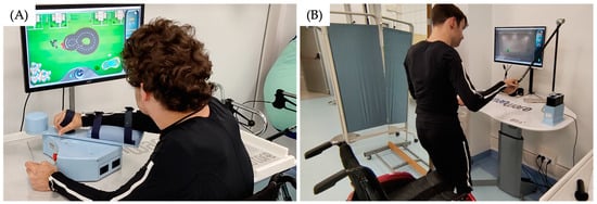 The Motore device (Humanware Srl, Pisa, Italy) is a robotic system characterized by a handgrip, integrated sensors for movement tracking, and a customizable resistance (Figure 2A). It supports upper limb motor rehabilitation by providing real-time visual and auditory feedback through a control unit and a graphical interface, enabling therapists to implement individualized neuromotor training programs. The Motore device operates in a 2D plane and includes forearm support, offering task-specific therapy in a compact format that can be adapted to various rehabilitation settings [].