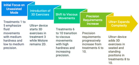 The rehabilitation program evolved progressively across the ten sessions, and it was tailored to the patient’s capabilities and progressively increased in complexity and difficulty aligned with motor learning principles. Initially, treatments 1 to 5 emphasized fluid movements in unassisted mode with moderate resistance and precision. As outlined in Figure 3, after these first five sessions, the treatment was shifted to viscous movements with increased resistance and precision demands by intensifying three key areas: (a) resistance provided by the devices, (b) the level of precision required, and (c) exercises performed in either 2D or 3D, in both sitting and standing positions. In particular, the Ultra+ device introduced 3D exercises starting in treatment 3, expanding to seated and standing positions by treatments 8 to 10, enhancing feedforward postural control related to upper limb function. These adjustments were meticulously planned to align with motor learning principles, ensuring that the patient’s rehabilitation was both challenging and achievable, promoting consistent progress toward functional recovery.