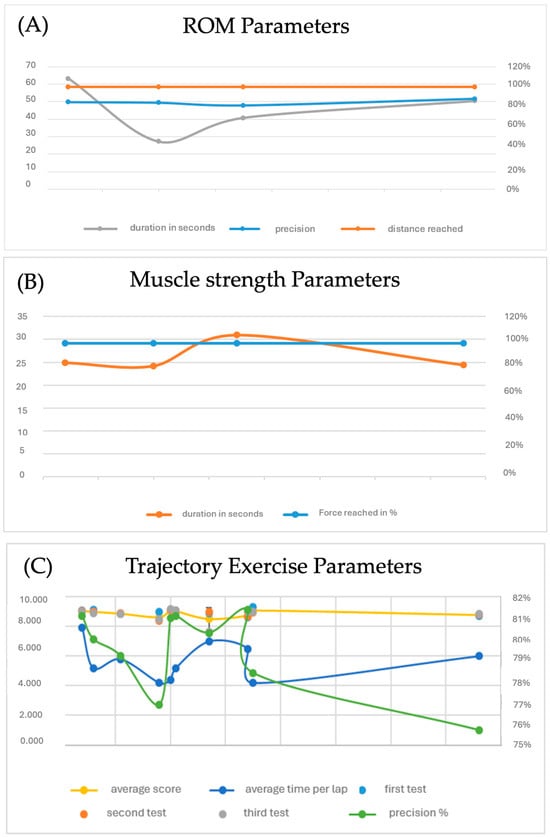 As shown in Figure 4, Panel A about ROM measurements revealed increased joint mobility during the training period, while metrics such as exercise scores, target accuracy, execution duration, and work precision showcased the patient’s ability to manage progressively challenging tasks. Panel B shows values related to muscle strength, which remained virtually constant throughout the study, indicating the maintenance of good performance. These findings highlight a stable performance in distance and force metrics, with minor fluctuations observed in precision and playing time over the course of the sessions despite increasing the task complexity. Panel C shows that, with the increasing difficulty of the exercises, a decrease in accuracy percentage was observed in some cases due to the need to restrict upper limb movement. However, scores related to tracking and trajectory exercises, as illustrated, remained stable, suggesting that the patient could adapt to new challenges with a stable success margin. This adaptation suggests ongoing neuroplasticity, a crucial aspect of long-term recovery.