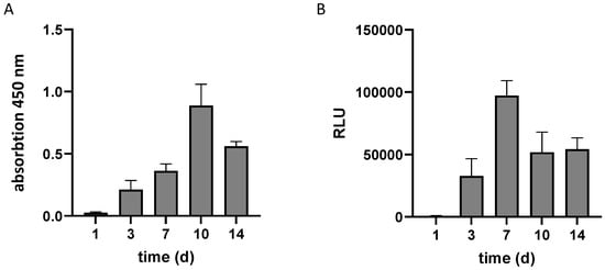 The metabolic activity of the encapsulated T17b cells was assessed using the Colorimetric Cell Viability Kit I (WST-8, PromoCell, Heidelberg, Germany) following the manufacturer’s instructions. The viability assay was performed on days 1, 3, 7, 10, and 14 to evaluate the viability and proliferation of T17b cells. Next, a 10% (v/v) WST-8 solution was added to the cell culture medium and incubated for two hours at 37 °C. Subsequently, 100 µL of the supernatant was transferred into a black 96-well plate (Greiner Bio-One, Kremsmünster, Austria), and the absorbance was measured at 450 nm using a microplate reader (Thermo Fisher Scientific). The release of TNFR2-Fc-GpL from the cells was determined by measuring the GpL luciferase activity of TNFR2-Fc-GpL in the supernatant after 1, 3, 7, 10, and 14 days. For this purpose, 10 µL of the supernatant was taken and mixed with 90 µL of a DMEM medium containing 0.5% (v/v) FCS and 1% (v/v) Pen/Strep, and the relative light units (RLUs) were determined using a luminometer (Berthold Technologies, Bad Wildbad, Germany), as described by Trossmann et al. [20].