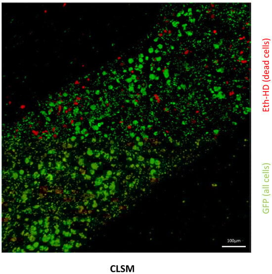 The confocal laser scanning microscopy (CLSM) of transfected T17b cells within an eADF4(C16)-RGD spider silk scaffold also indicates that the majority of cells remain viable following overnight incubation. All cells display GFP fluorescence, while dead cells are red, based on ethidium homodimer-I staining (Eth-HD) (scale bar: 100 µm).