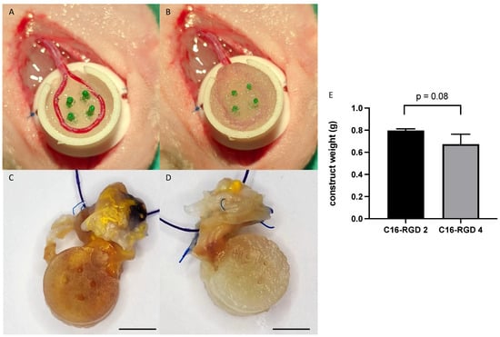 Images during the AV loop surgery: A 1 cm diameter PTFE chamber is half filled with the hydrogel, and the AV loop is placed into the chamber on the hydrogel surface. The green columns provide support to stabilize the AV loop and maintain its position (A). Afterwards, the AV loop is covered with hydrogel until the chamber is filled completely with hydrogel (B). Images of the explants 2 weeks (C) and 4 weeks (D) after implantation show a stable construct and yellow color around the entrance of the chamber due to the perfusion with Microfil®. Scale bar: 0.5 cm. No significant differences were found between construct weights after 2 (C16-RGD 2) and 4 (C16-RGD 4) weeks of implantation (E).