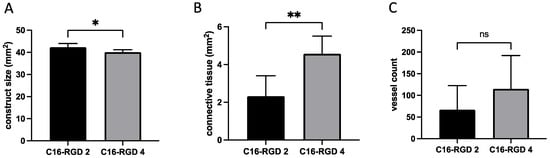 Quantification of histological findings: Construct size decreased significantly (A), while newly formed connective tissue increased significantly over time (B). Vessel count did not increase significantly when comparing 4 weeks and 2 weeks after implantation (C). (ns = not significant; * p ≤ 0.05; ** p ≤ 0.01).