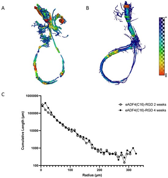 The AV loops were perfused with Microfil® and analyzed using µCT. Image reconstruction of µCT scans 2 (A) and 4 (B) weeks after the implantation of eADF4(C16)-RGD hydrogels in the presence of T17b cells. The scale bar depicts the mean vessel radius in micrometers. The numeric colors represent the vessel radius from small (blue, 5 µm) to large (red, 500 µm). The quantitative analysis of the cumulative length relative to the vessel radius (µm) (C).