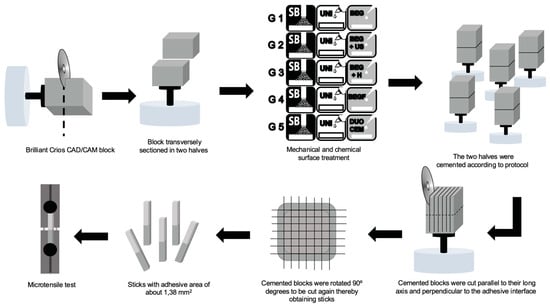 The blocks were stored in distilled water at 37 °C, for 24 h, prior to microspecimen preparation. All the materials, manufacturers, LOT, and compositions are displayed in Table 2.