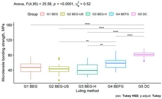 Descriptive statistics, the number of tested specimens, and µTBS results are depicted in Table 3 and schematically represented in Figure 2. The assumptions of normality and homogeneity of variances of the ANOVA were met, with non-significant results for both the Shapiro–Wilk test for each group (p > 0.05) and for the Levene test (p > 0.05). One-way ANOVA revealed statistically significant differences amongst groups (F(4.95) = 25.6, p < 0.01). Pairwise comparisons between groups indicated significant differences among the μTBS mean values of DC (Group 5) and the other groups, the former having the highest bond strength values. Also, BEGF (Group 4) was statistically different from all except for BEG (Group 1). Tukey’s homogenous means subsets are displayed in Table 4. Three different subsets are identified, corresponding to the lowest values of mean μTBS, intermediate values of mean μTBS, and highest values of mean μTBS. All BEG-based groups are within the lowest subset. G1-BEG also shares the intermediate subset with G4-BEGF while G5-DC stands isolated in the highest mean μTBS values subset.