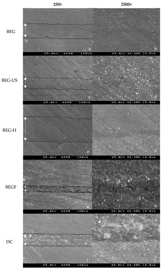 SEM images of the bonding interfaces where arrows indicate cement layer thickness. (a) BEG, 250×; (b) BEG, 2500×; (c) BEG-US, 250×; (d) BEG-US, 2500×; (e) BEG-H, 250×; (f) BEG-H, 2500×; (g) BEGF, 250×; (h) BEGF, 2500×; (i) DC, 250×; (j) DC, 2500×.