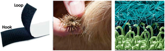 Velcro (left); natural inspiring element (centre); microscopic image of Velcro (right) [13].