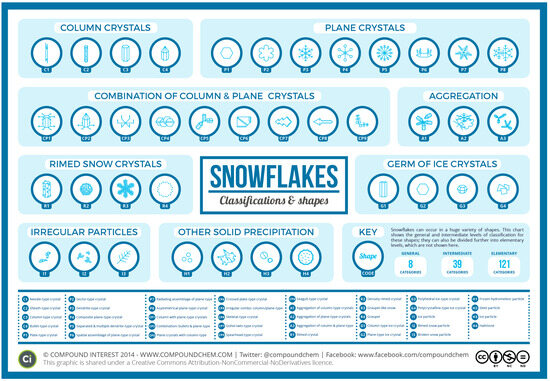 Graph created by British chemistry professor Andy Brunning, illustrating 39 types of solid precipitation, including 35 types of crystals or snowflakes, as well as hail and ice [24,25].