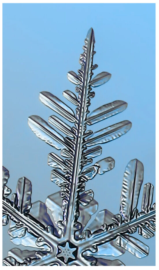 The complexity of snowflake shapes is evidenced by their lacy and branched structure, which is made up of the way water molecules travel through the air to condense into a snow crystal; the more the molecules need to diffuse through the air to reach the crystal, the more the growth is slowed down [27]. In addition, the more water molecules that collide with the forming crystal, the faster it grows. This is called branching instability, which is responsible for the development of complex shapes, which are the small protrusions that develop on larger branches, thus forming side branches. When branching instability is subsequently applied to a growing crystal, the result is called an ice dendrite [26] (Figure 3). The amount of branching is directly proportional to the atmospheric pressure, i.e., the lower the pressure, the fewer the branches that are generated [21,22].