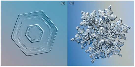 Faceted snowflake in the shape of a hexagonal prism (a) and branched snowflake with a complex structure (b) [29,30].