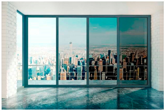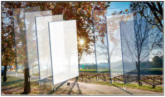 The applicability to glass represents an innovative technology that interacts naturally with sunlight, changing its colour in response to heat exposure. As UViii ray incidence increases, the glass darkens. According to Chohfi [47], the uniqueness of this material lies in its ability to change colour without the need for electricity or human intervention, functioning as a completely autonomous and mechanical process (Figure 12).