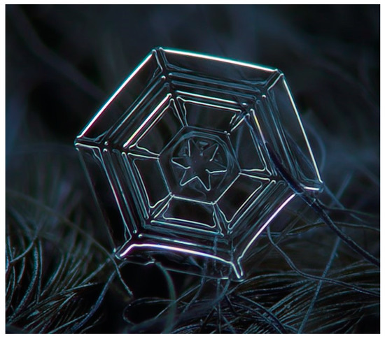 The first scientific reference to snowflakes dates back to 1611 when Johannes Kepler published the treatise On the Six-Cornered Snowflake; he raised the question of why snowflakes have a sixfold symmetry—not referring to the atomistic point of view—and speculated that the hexagonal packing of spheres might have something to do with the shape of snow crystals [14,15,16,17]. Another historical reference dates to 1665, when Robert Hooke published the work Micrographia, containing sketches of elements that he was able to analyse through a microscope, which at the time was a recent invention; this volume contained the first graphic representations of snow crystals, revealing their complexity and structural symmetry [18]. Although questions and curiosities had been raised for centuries, many answers were only clarified later, when modern crystallography emerged in 1911, and snowflakes became objects of study.